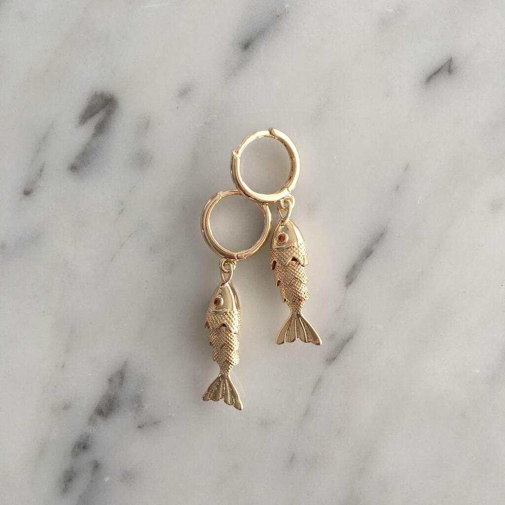 Aritos bañados en oro. La argolla mide 1.2 cm aproximadamente y el pescado mide 2.5 cm aproximadamente.